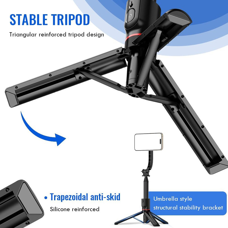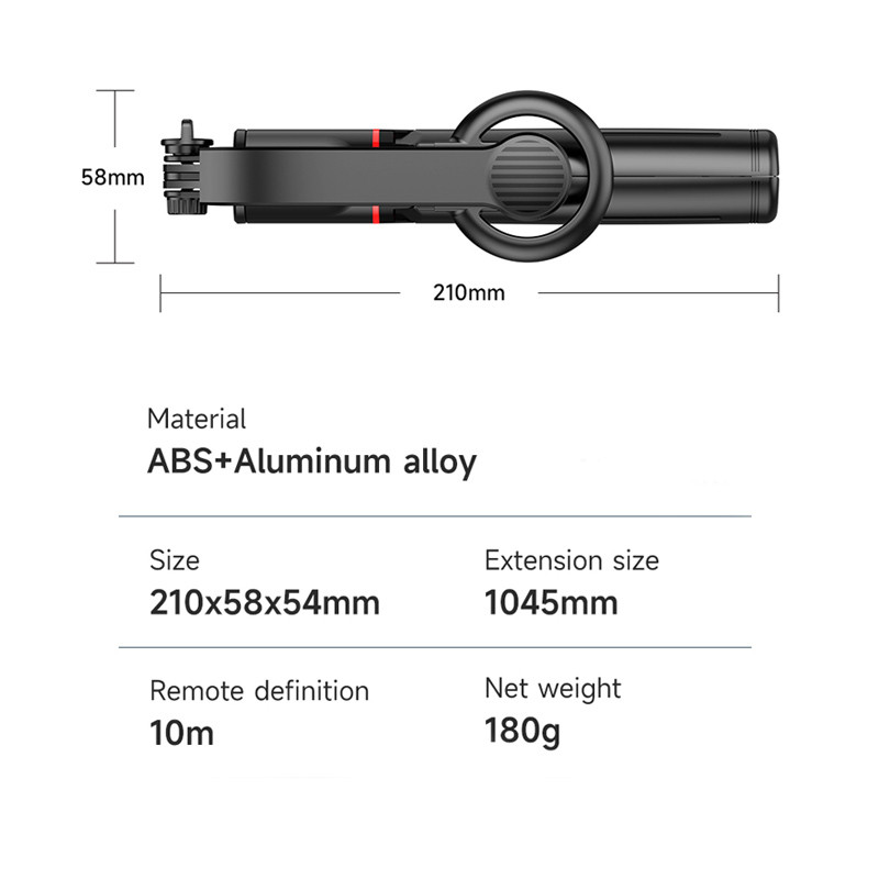 جنس آلومینیوم و ABS | چرخش 360 درجه | باتری شاتر قابل تعویض و از نوع CR1632 | پایه مقاوم و سنگین | قابلیت تنظیم طول تا 1045 میلیمتر | حالت جمع شده تنها 210 میلیمتر و قابل حمل