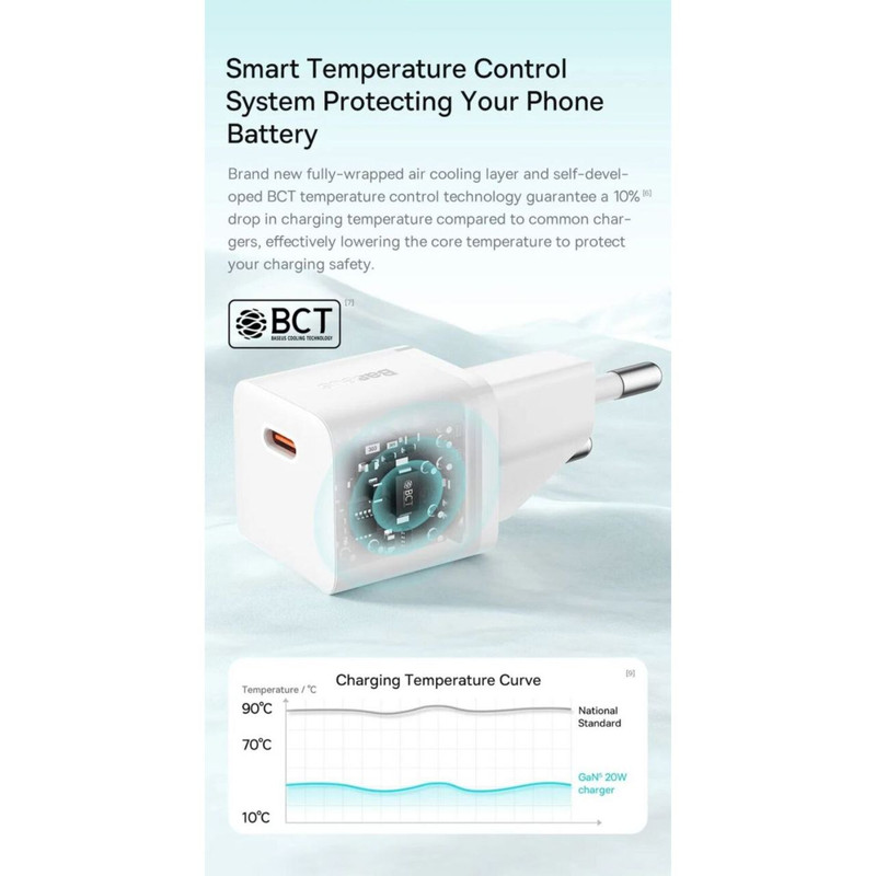 شارژر Baseus دستگاه های شما را ایمن نگه می دارد. فناوری کنترل دمای BCT که بهویژه توسعه یافته است، افت دما را تا 10 درصد در مقایسه با شارژرهای معمولی تضمین میکند. به لطف این، از تجهیزات متصل حتی بهتر محافظت می کند و محافظت کامل از آنها را فراهم می کند.