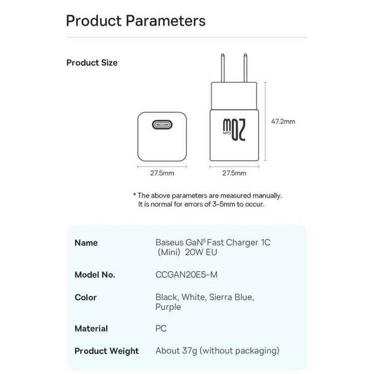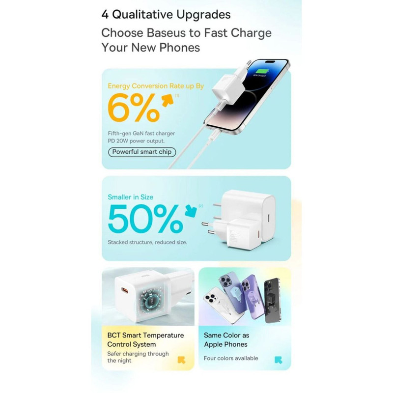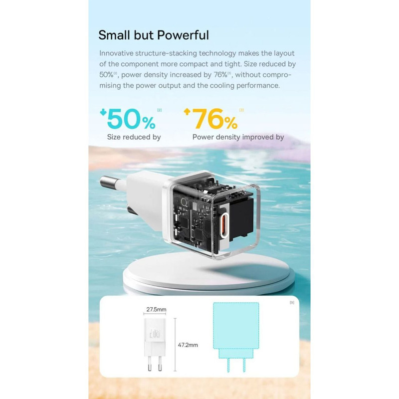 شارژر دیواری Baseus مجهز به فناوری GaN است که استفاده از آن را راحت می کند. اگرچه اندازه جمع و جور آن ممکن است شما را شگفت زده کند، فریب نخورید. این شارژر با وجود اندازه کوچکش، قدرت واقعی را پنهان می کند. با 20 وات قادر است گوشی شما را تنها در 26 دقیقه تا 50 درصد شارژ کند. برای کسانی که از کارایی و عملی بودن قدردانی می کنند عالی است. این شارژر گواه این است که قدرت فوق العاده می تواند در یک بسته کوچک جا شود.