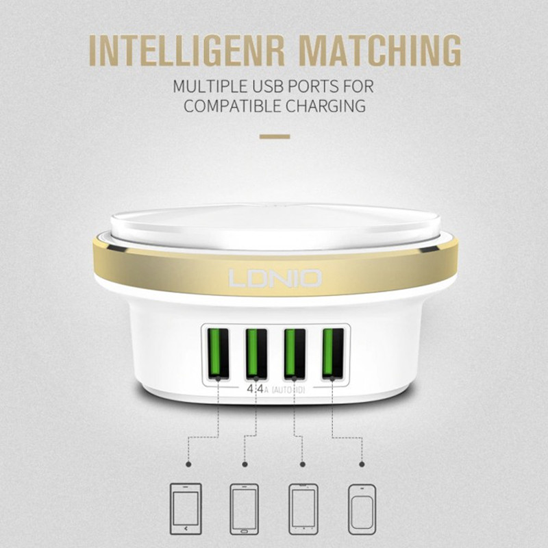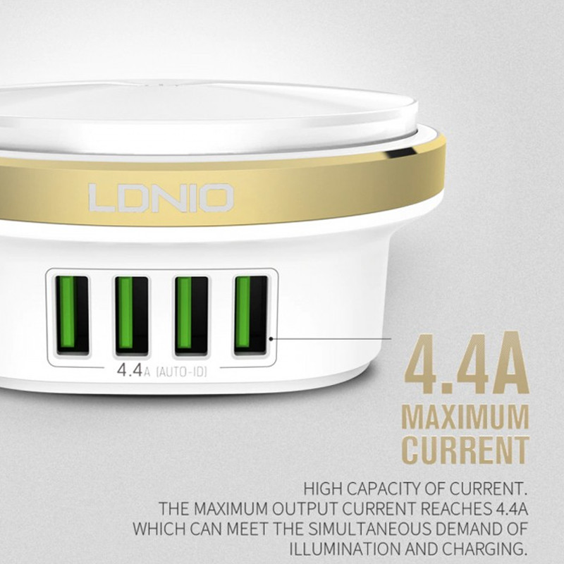 هاب الدینیو مدل Bedside Lamp همینطور دارای 4 پورت USB جهت شارژردهی می باشد. این پورت های USB دارای تکنولوژی Auto-ID هستند و شدت جریان خروجی را بسته به دستگاه متصل به آن به خوبی تنظیم و کنترل می کنند. این ویژگی سبب افزایش عمر باتری دستگاه متصل نیز می شود. توان خروجی این سه پورت 4.4 آمپر و 5 ولت بوده و لامپ های LED نیز دارای حداکثر توان 2.4 وات می باشند. البته تعداد لامپ های LED به کار رفته 12 عدد است. درجه حرارت لامپ این چراغ خواب 6500K می باشد.