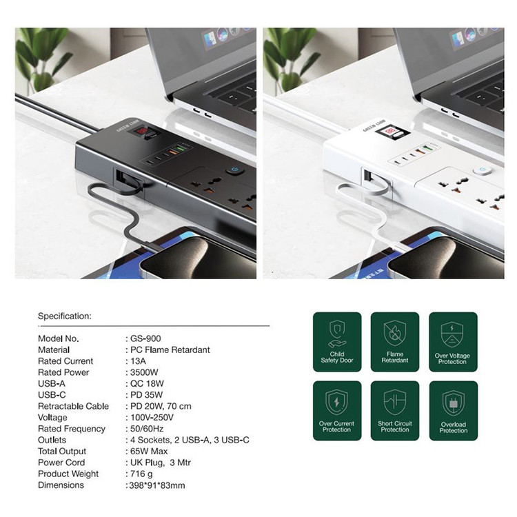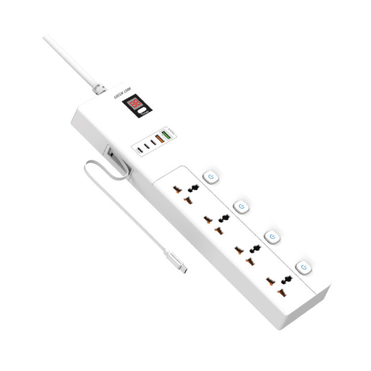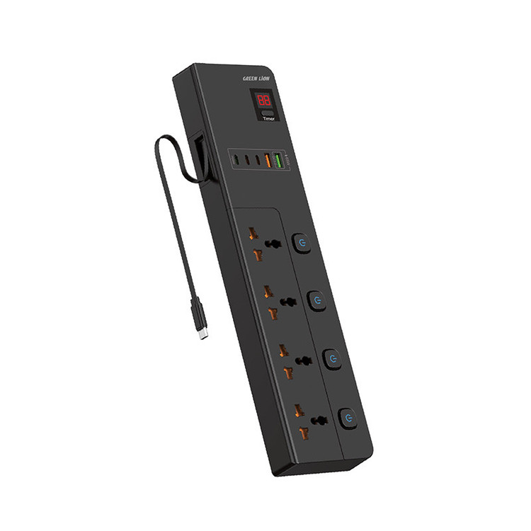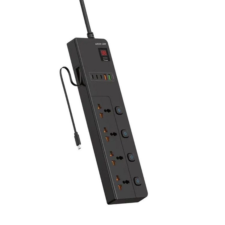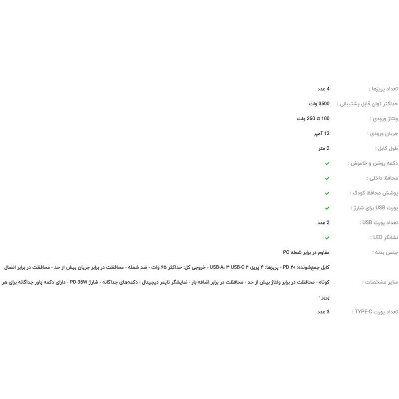 دو پورت USB-A | سه پورت Type-C | کابل متصل از نوع تایپ سی | نمایشگر دیجیتال | طول کابل 2 متر | پریزهای برق از نوع Universal