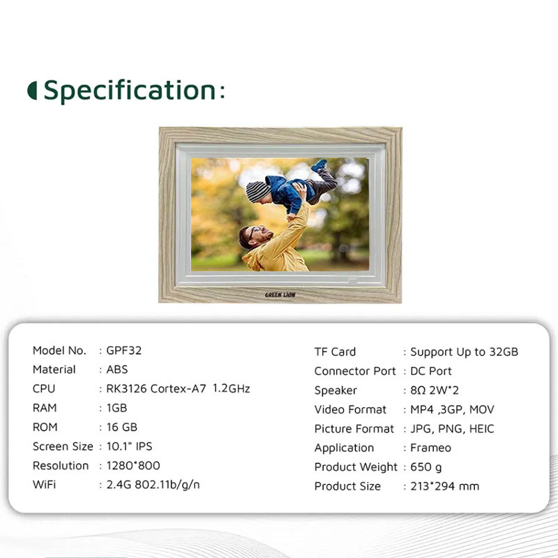 صفحه نمایش 10.1 اینچ و لمسی | پشتیبانی از کارت TF | اشتراک گذاری بی سیم از طریق wifi و frameo | پشتیبانی از فرمت های مختلف JPG | PNG | HEIC | MP4 | 3GP | MOV