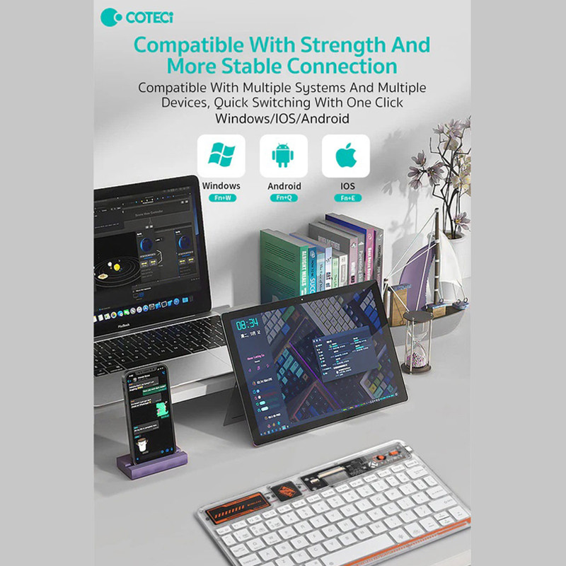 جنس کیبورد بلوتوثی کوتتسی مدل 84012 از پلاستیک ABS بوده که مقاومت خوبی دارد و همچنین دارای کف غیر لغزنده دارد که برای هر سطحی مناسب است. این محصول را می توانید به صورت بلوتوثی به دستگاه خود متصل کنید و یکی از قابلیت های کاربردی این محصول اتصال به چند دستگاه (حداکثر 3 دستگاه) به صورت همزمان است؛ شما می توانید این کیبورد را به موبایل، تبلت و کامپیوتر متصل کرده و از آن استفاده کنید. باید توجه داشته باشید در هنگام اتصال به 3 دستگاه، به صورت همزمان نمی توانید از کیبورد استفاده کنید و باید بین دستگاه جابجا شوید (سوئیچ کنید) و برای استفاده از این ویژگی باید دستگاه های شما (گوشی و تبلت) از این قابلیت پشتیبانی کند. این کیبورد با سیستم عامل اندروید و IOS نیز سازگاری دارد.